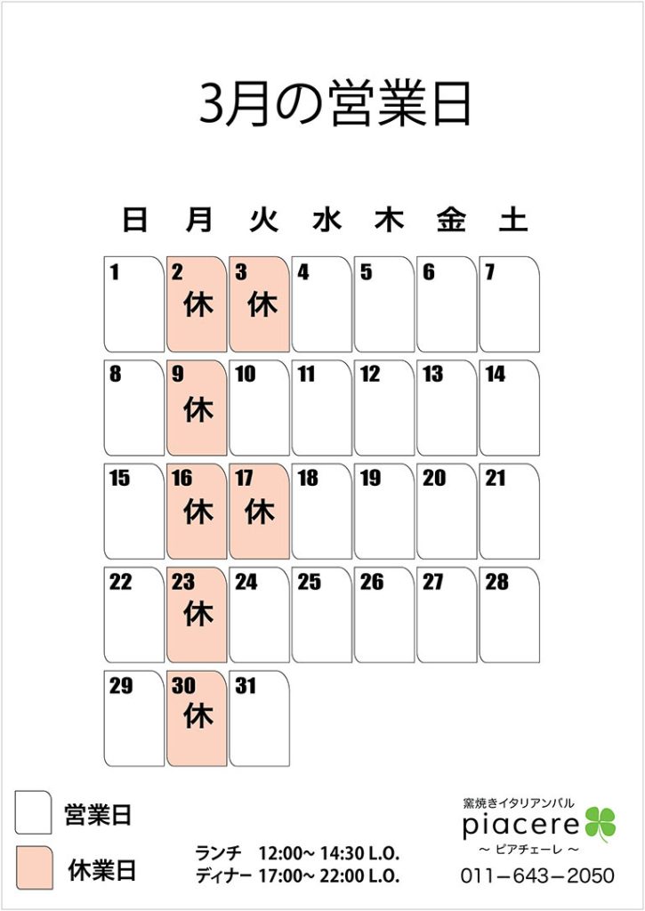 投稿日: 2026年2月26日2026年2月26日 投稿者: スタッフ3月の営業日のお知らせ いつもご来店誠にありがとうございます。3月の営業日は下記の通りとなっております。 皆様のご来店を心よりお待ちしております。