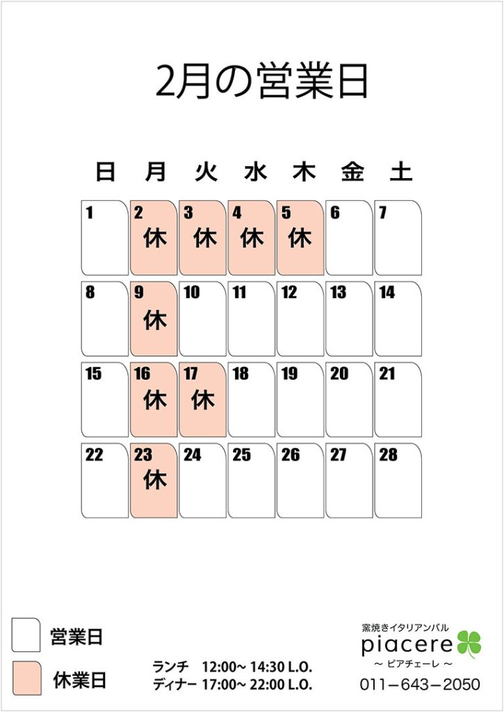 2月の営業日は下記の通りとなっております。